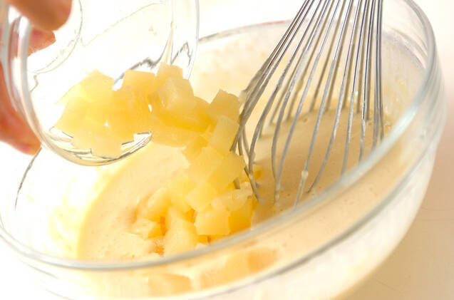 牛乳を加えて混ぜ合わせ、振るった粉類を加えて粉っぽさがなくなったらパイナップルを加え、さらに混ぜ合わせる。