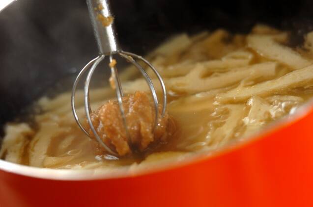 鍋にだし汁を入れて強火にかけ、煮たったら絹ごし豆腐、油揚げを加える。再び煮たったら火を弱め、みそを溶き入れる。器に注ぎ入れ、刻みネギを散らす。