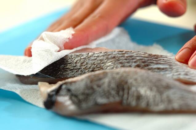 スズキは塩を振って5分置き、水分を拭き取って臭みを抜く。