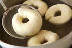 熱湯に砂糖を入れ、沸騰しているお湯の中に静かに入れる。片面20秒位ずつ両面ゆでて網等ですくい上げ、天板のオーブンシートに戻す。