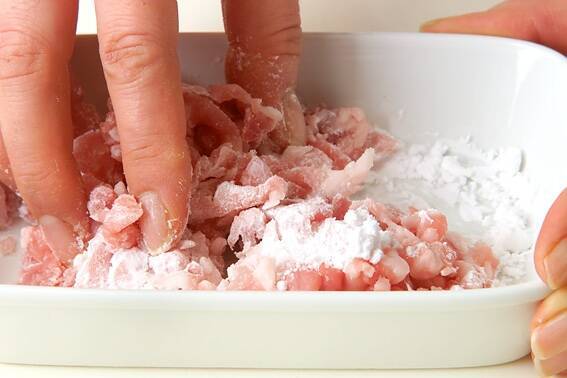 豚もも薄切り肉は細切りにし、片栗粉をまぶしつける。