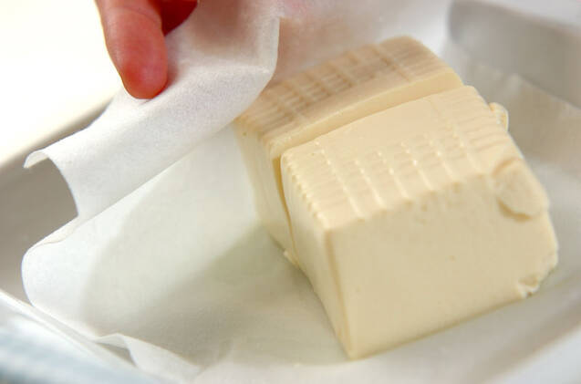絹ごし豆腐は半分に切り、キッチンペーパーを敷いた耐熱皿に並べ、電子レンジで1~2分加熱して水分をきる。
