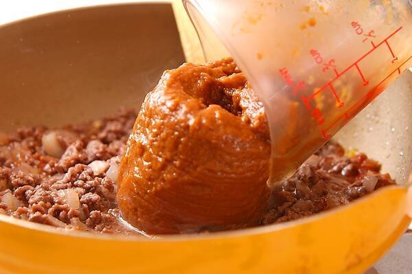 <ミートソース>を作る。玉ネギはみじん切りにして、フライパンにサラダ油を中火で熱し、玉ネギが少し透き通るまで炒め、牛ひき肉を加え炒め合わせる。塩コショウ、ケチャップを加え全体になじめば、赤ワイン、デミグラスソースを加え、2~3分煮て火を止める。