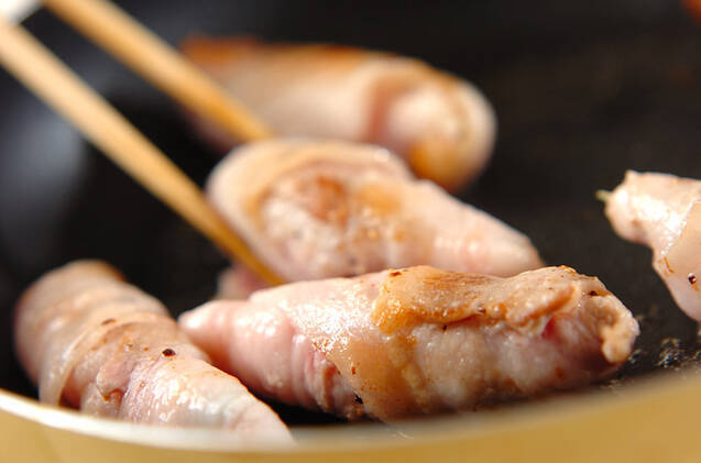 フライパンにを熱し、(1)の巻き終わりを下にしてフライパンに並べ、転がしながら全体に薄く焼き色がつくまで焼く。