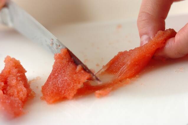 しらたきは熱湯でサッとゆでてザルに上げ、食べやすい長さに切る。タラコは薄皮を除き、中を包丁でしごき出す。