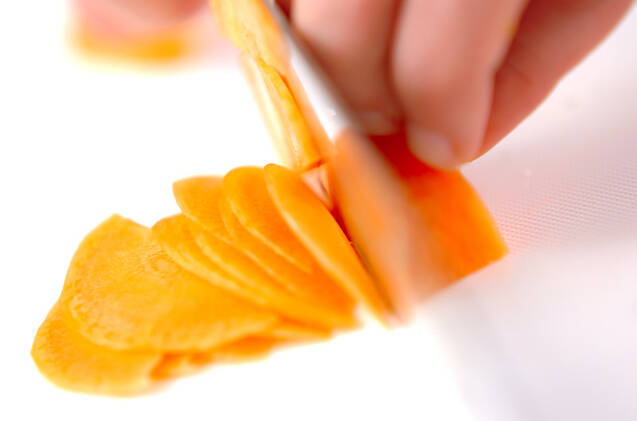 ニンジンは皮をむいて縦半分に切り、薄い半月切りにする。