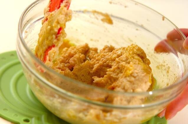 ボウルに入れ、レモンを絞り入れ、カレー粉、EVオリーブ油、塩も加え混ぜ合わせる。