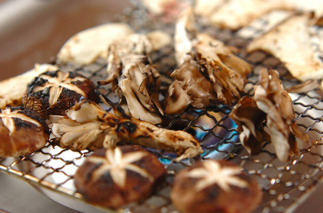 マイタケ、シイタケ、エリンギを薄くサラダ油をぬった焼き網で、薄く焼き色がつくまで焼く。