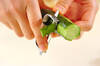 キュウリは縦じまに皮をむいて薄い輪切りにし、塩でもむ。しんなりしたら水洗いして水気を絞る。