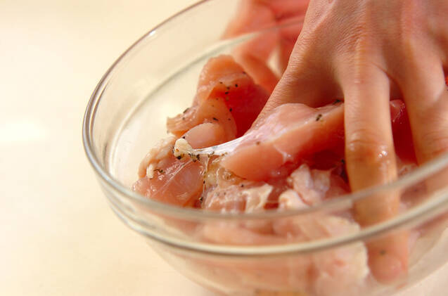 鶏むね肉はひとくち大の削ぎ切りにして、<下味>の材料をもみ込む。
