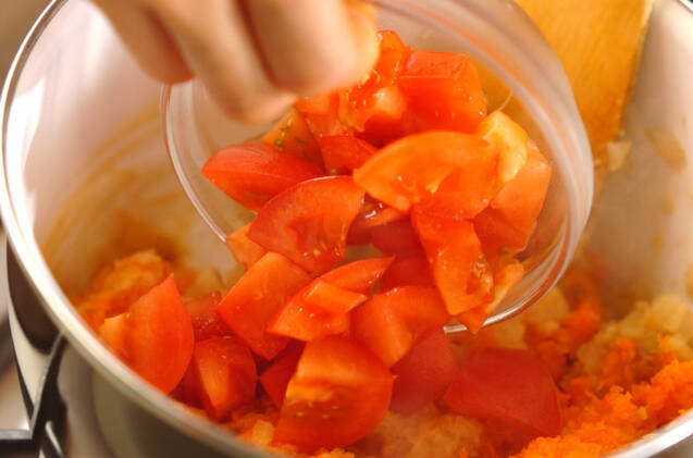 (1)の鍋にすりおろしニンジン、すりおろしジャガイモ、トマトを加えて炒め合わせ、ローリエ、赤唐辛子、<練りカレー>を加え、弱火で炒め合わせる。途中、鍋に焦げつきそうになったら、分量外のサラダ油を少々足す。