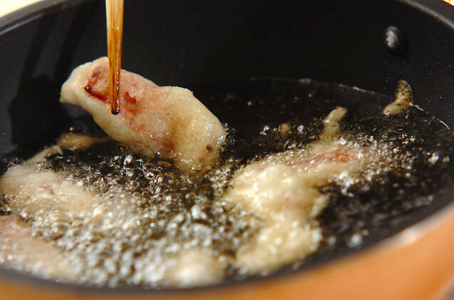 イカは<衣>に通して170℃の揚げ油でサクッと揚げ、しっかり油をきる。
