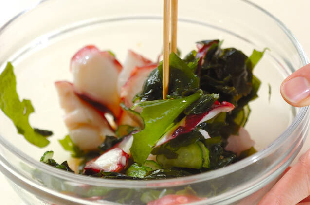 <合わせ酢>のボウルにゆでタコ足、ワカメ、キュウリを加えて和え、器に盛る。