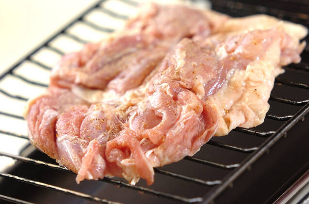 グリルの焼き網に薄くサラダ油をぬり、鶏もも肉の皮を下にして並べ、焼く(表面が焦げる場合は、アルミホイルをかぶせ、焼き色を加減して下さい)。
