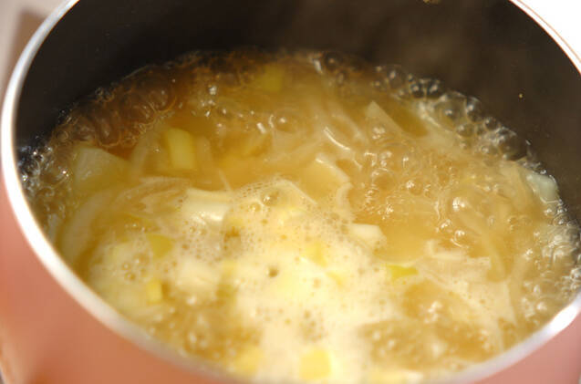 鍋にバターを熱し、ジャガイモ、玉ネギ、白ネギを加えて炒め合わせる。固形スープの素、水を加え、煮たったら火を弱めて7~8分煮る。