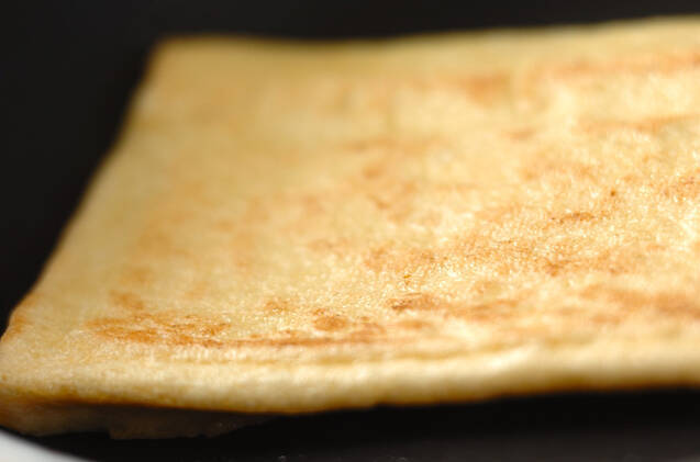 フライパンを熱して何もひかず油揚げをのせ、両面焼き色がつくまで焼く。縦半分に切り、さらに幅5mmに切る。