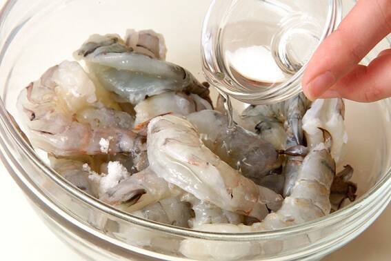 エビは殻をむき、尾もひっぱって殻を取り除く。背に切り込みを入れて背わたを取り除き、塩水で洗う。水気を切り、酒、塩をまぶす。