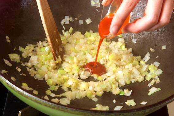 1のフライパンにサラダ油大1を加えて熱し、白ネギ、ショウガ、ニンニクを炒める。香りが立てばチリソースを加え、サッと炒める。チリソースは、好みの辛さに合わせて量を調整してくださいね。