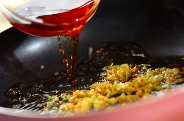 (3)に白ネギを加え、透き通るまで炒めたら<調味料>を加え、ひと煮たちさせる。<水溶き片栗>を入れてトロミがつくまで煮る。