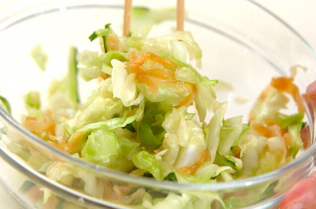 <合わせ酢>のボウルに塩クラゲ、キャベツ、キュウリを加えて和え、器に盛る。