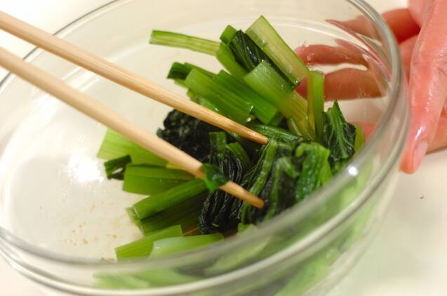 ボウルに<調味料>の材料を混ぜ合わせ、小松菜を加えて混ぜ合わせる。