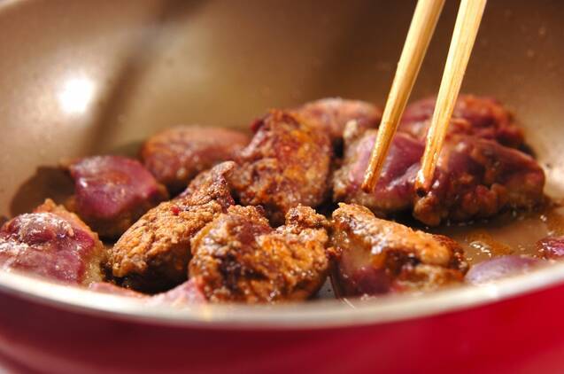 フライパンにゴマ油をひいて中火で熱し、片栗粉をまぶした鶏レバーを炒める。火が通ったらニラとミョウガを入れ、しんなりするまで炒める。