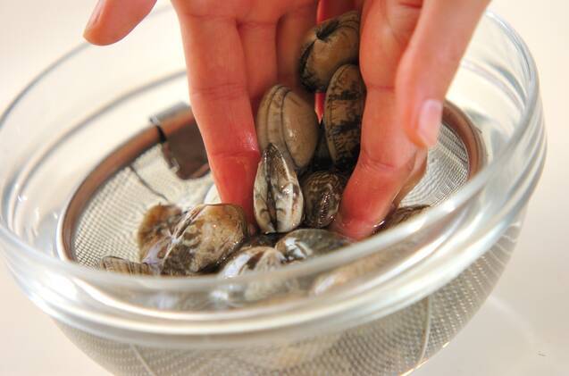 春キャベツはザク切りにする。アサリは分量外の塩水につけ、殻同士をこすり合わせて洗い、ザルに上げる。