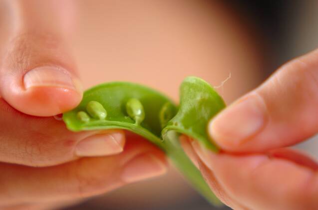 ベーコンは幅2cmに切る。スナップエンドウは両側の筋を引いて取り除き、半分に裂く。