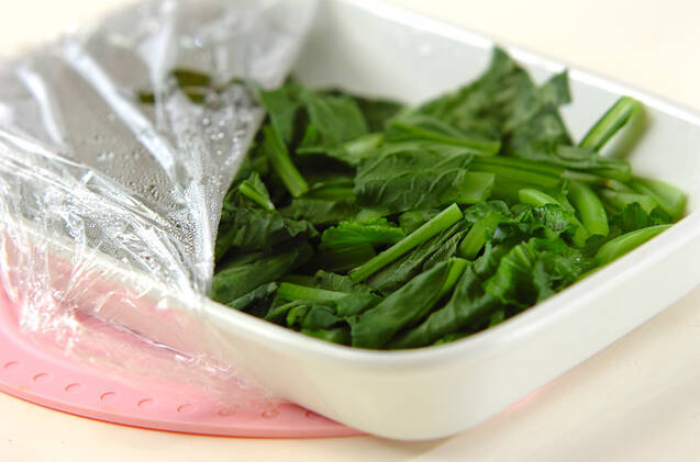小松菜は根元を切り落として長さ3cmに切り、耐熱容器に入れてラップをかけ、電子レンジに2~3分かける。絹ごし豆腐はサッと水洗いして4つに切り、耐熱容器に入れて電子レンジで2~3分加熱する。電子レンジは600Wを使用しています。