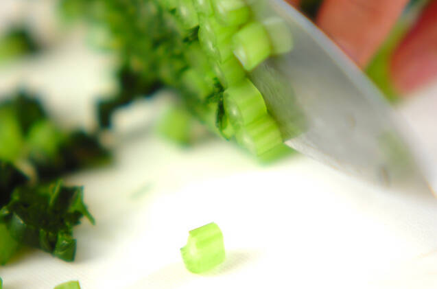 カブは皮をむいてすりおろし、軽く水気をきる。茎は適量を分量外の塩を入れた熱湯でゆでて水に取り、粗熱が取れたら幅5mmに切る。