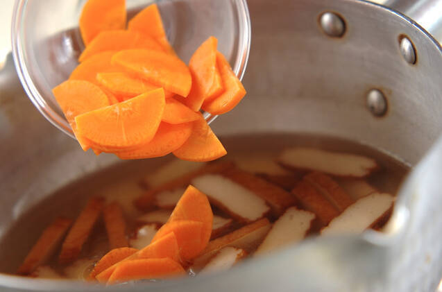 鍋に<合わせだし>を入れて強火にかけ、煮たったらさつま揚げ、ニンジンを2~3分煮る。