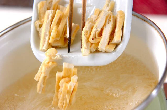 鍋にだし汁を入れて火にかける。煮立ったら大根を入れ、大根が透き通ってきたら油揚げを加える。