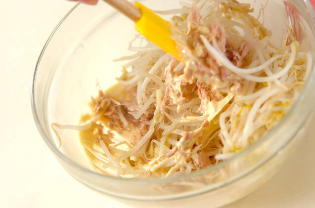 <調味料>のボウルに(1)のモヤシとツナを入れ、よく混ぜ合わせる。器に盛り、刻みネギを散らす。