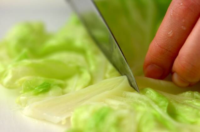 キャベツの葉は軸の堅い部分は削ぎ切りにし、軸に浅く切り込みを入れ、切り取った軸はみじん切りにする。