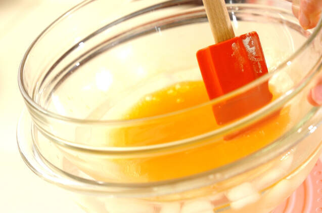 (4)に板ゼラチンの水気を絞って加え、混ぜ溶かして、さらにホワイトキュラソーも加えて混ぜる。ボウルに氷水をあてながら冷ます。