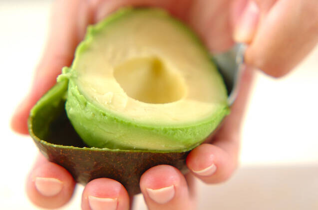 アボカドは包丁を縦に入れ、種まで深く切り込みを入れ、両手でひねるように半分に分ける。種を取り、果肉をスプーン等で取り出し、ひとくち大に切ってレモン汁をからめる。