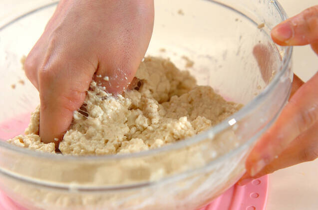 木綿豆腐のボウルに山芋、練り白ゴマを加えてよく混ぜ合わせ、片栗粉も加えて混ぜ合わせる。