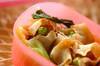豚ひき肉に<調味料>の材料を加えて粘りがでるまで混ぜる。シューマイの皮に包み、グリンピースをのせる。