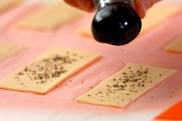 スライスチーズを2等分し、オーブンシートにのせ、粗びき黒コショウを振る。電子レンジで1分30秒~2分加熱する。粗熱を取り、器に盛る。