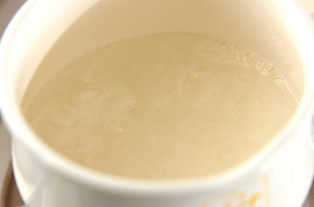 煮たったら砂糖を加え、吹きこぼれないように混ぜながら溶かし、煮たった状態の火加減で1分煮て火を止める。