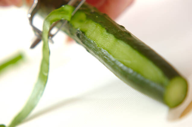 キュウリは縦じまに皮をむき、薄い小口切りにして分量外の塩をからめ、しんなりしたらサッと水洗いして水気を絞る。
