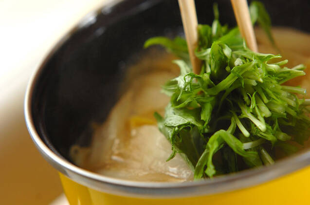 白菜、モヤシ、ニンジンを加えて5~6分煮る。さらに水菜を加え、しんなりしたら器に盛って七味唐辛子を振る。