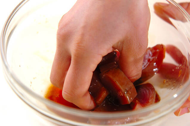 カツオは厚さ1cmに切り、<調味料1>をもみ込む。
