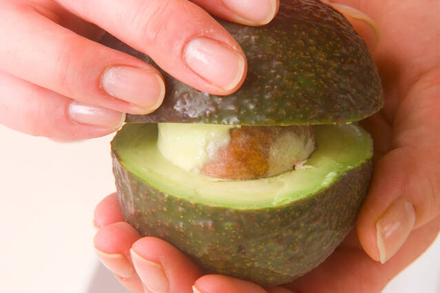 アボカドは種に沿って縦にクルッと1周切り込みを入れる。両手の平ではさみ、両側から押さえ付ける様にねじり、2つに分ける。包丁の角を種に刺してねじり取り、皮をむいて食べやすい大きさに崩し、レモン汁をからめる。