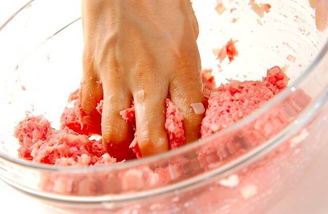 ボウルに<種>の材料、みじん切りのキャベツを入れ、よく混ぜ合わせ、8つの俵型にまとめる。