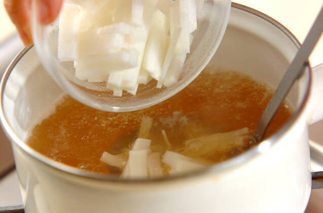 鍋に<スープ>の材料を入れて強火にかけ、固形チキンスープの素を煮溶かす。大根、ニンジンを加え、しんなりするまで煮る。
