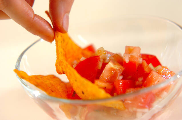 <ドレッシング>のボウルにトマトを加え、和える。器に盛り、トルティーヤを添える。