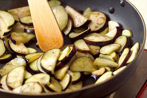 フライパンにオリーブ油を中火にかけ、水気を切ったナスを炒め、塩コショウをする。