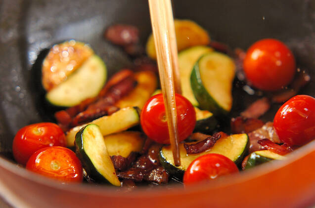ベーコンから脂がでてきたらズッキーニを加えて炒める。焼き色がついたらプチトマトを加え、塩をして少しクタッとしたら器に盛り、粗びき黒コショウを振る。