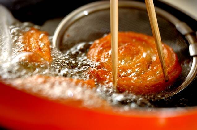 180℃の揚げ油に絞った生地の方を下にして入れ、クッキングペーパーが自然に剥がれてきたら取り除き、両面キツネ色に揚げる。